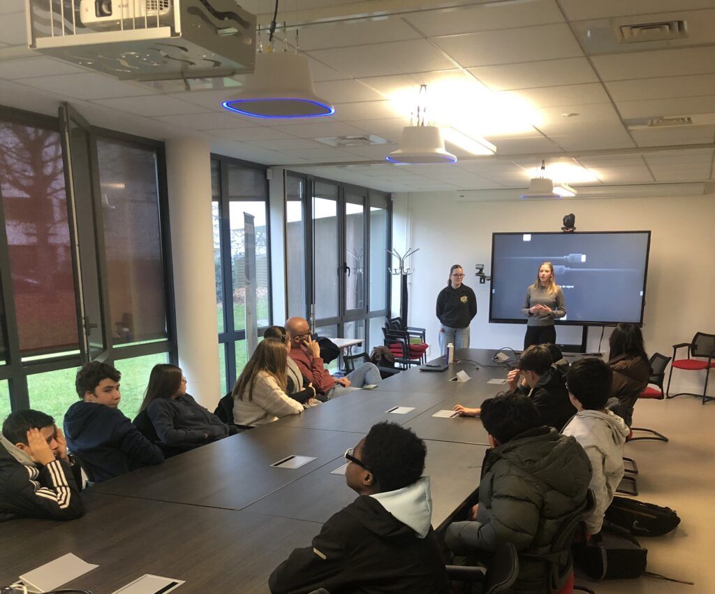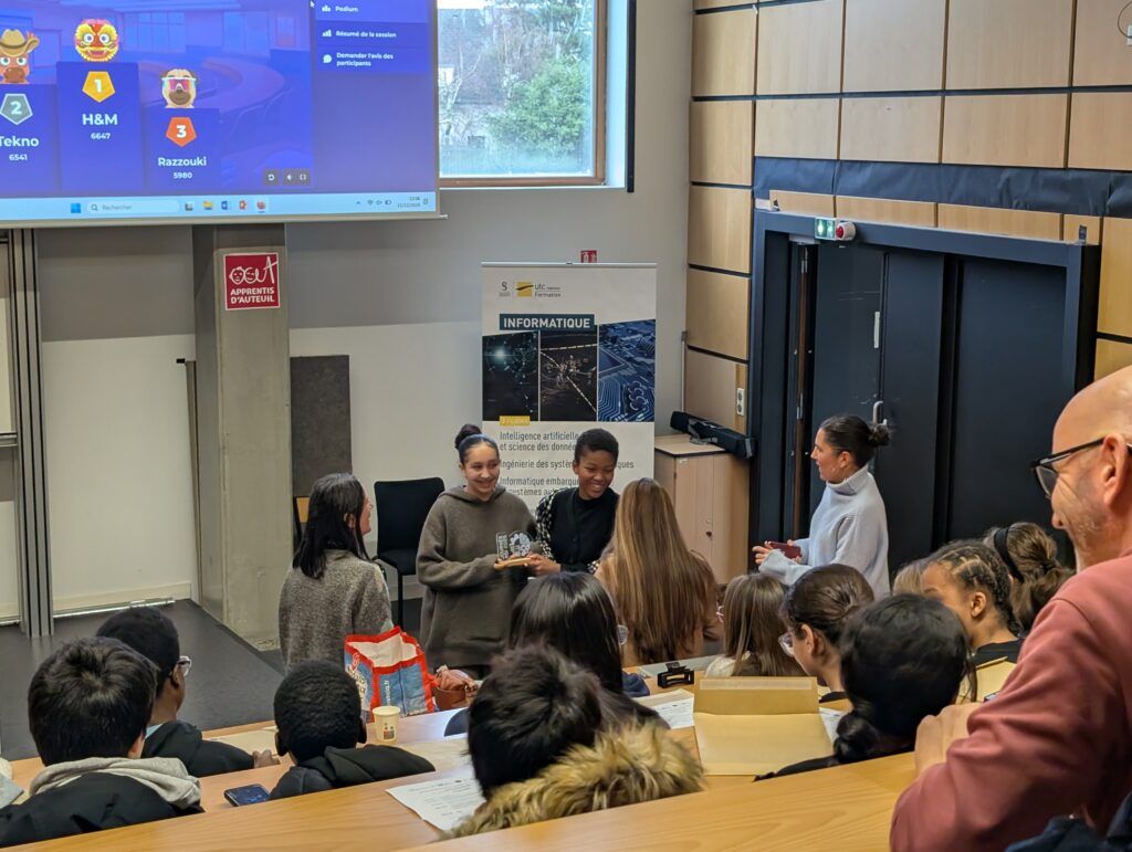 Les col­légiens ont égale­ment pu échang­er et dis­cuter avec les représen­tants de l’as­so­ci­a­tion Sci­ences Egales de l’UTC, et écouter le témoignage d’un doc­tor­ant sur son choix de par­cours et d’é­tudes. A l’is­sue des présen­ta­tions, un quizz a été organ­isé sur les dif­férentes inter­ven­tions présen­tées, et les gag­nants ont reçu un trophée.